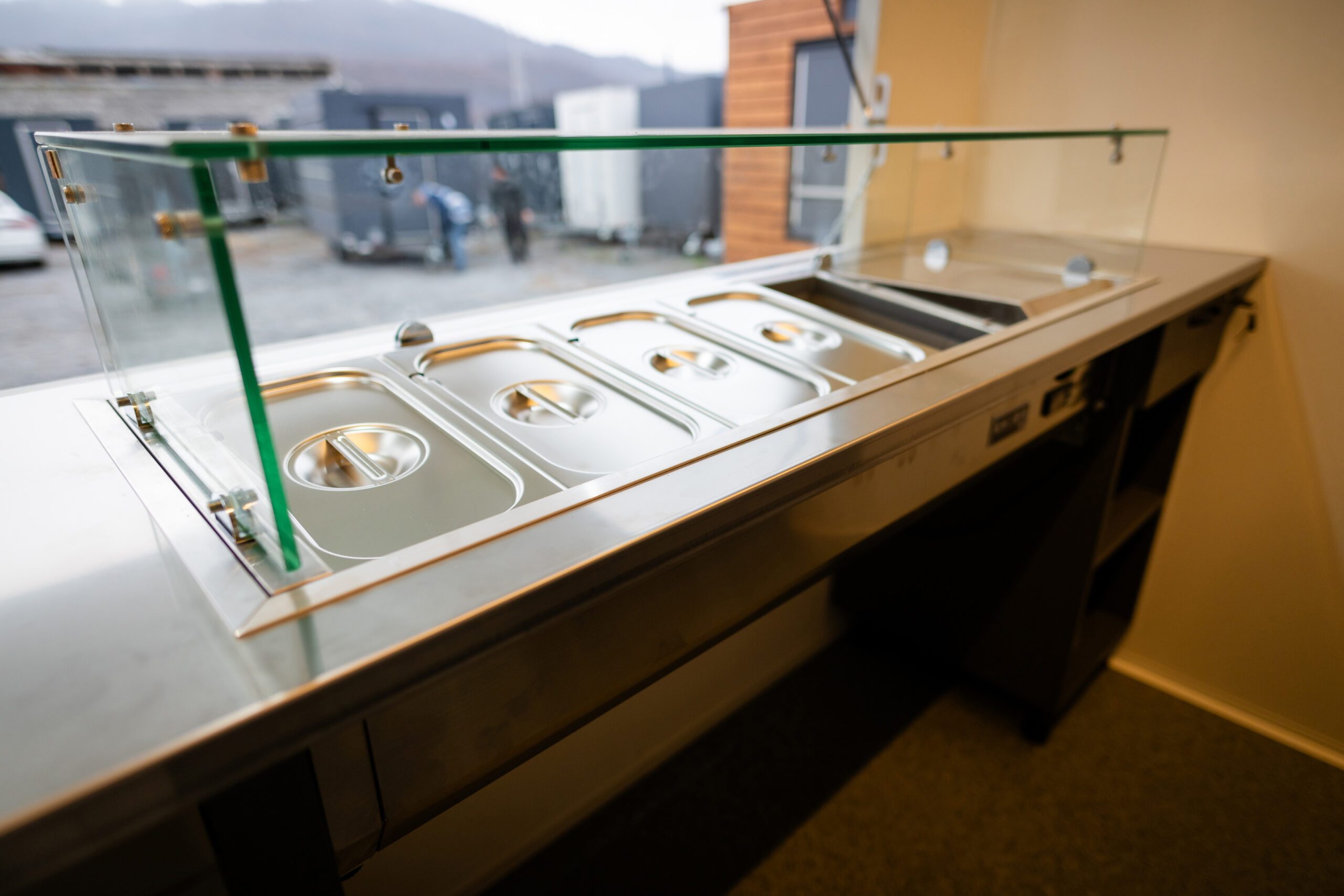 – Der Buffetwagen hat ein nach oben zu öffnendes Service Fenster, so dass unterhalb des Fensters eine 50 cm hohe Wand vom Boden aus zu sehen ist.